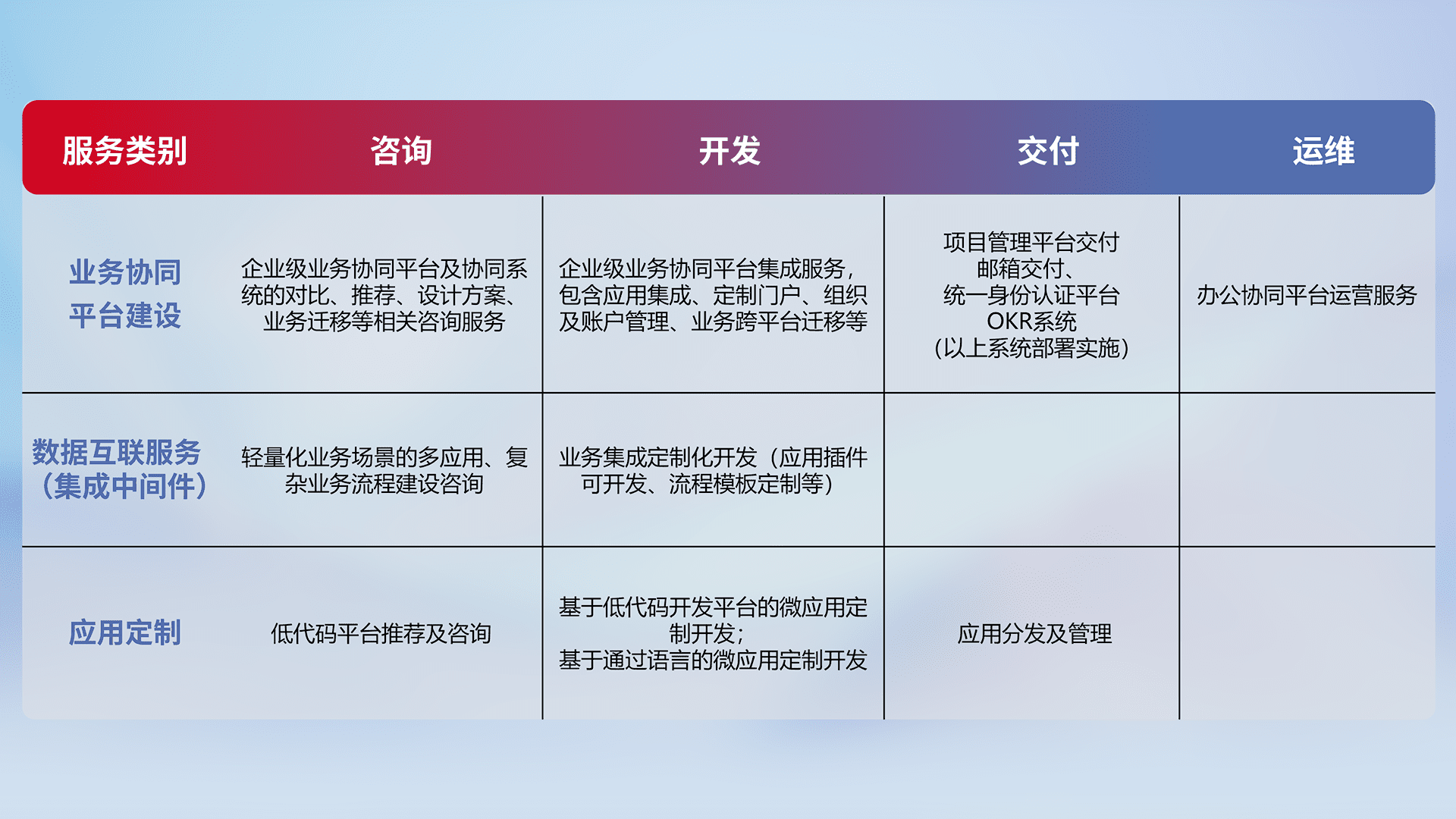 针对钉钉、、、、企微、、IDaas等平台级产品提供产品的规划、、、、方案、、交付、、、、定制化开发等服务,,,实现如统一协同办公、、智能客户服务、、混合会议管理、、智能数据查询、、、、等业务场景,,,,实现数字化转型。。
