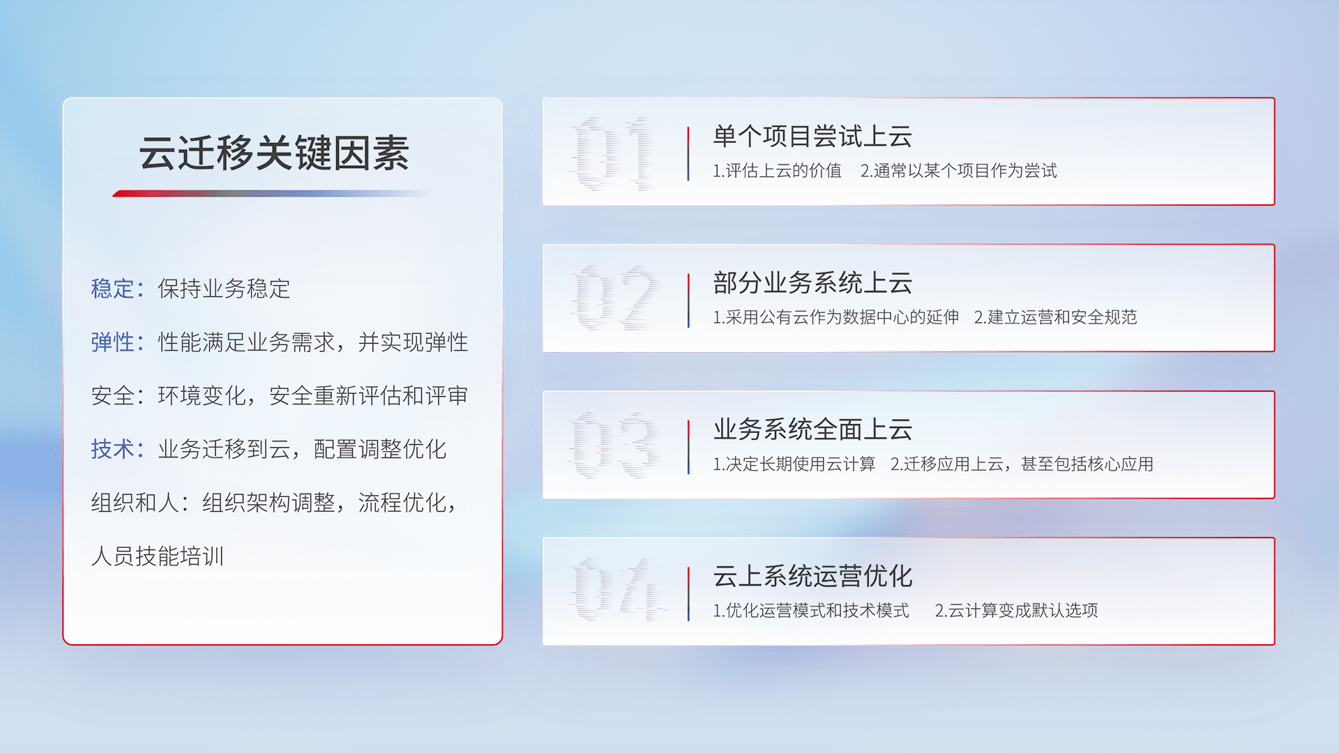 结合实际业务,,从规划设计、、、、云平台选型、、、云原生改造、、、、数据迁移、、、集成交付,,迁移全过程为客户识别最佳上云路径,,做好风险识别管理,,设计网络架构、、、、身份权限、、安全审计合规、、操作审计、、日志审计、、、监控告警策略、、多站点容灾设计等,,,,对云上基础设施进行整体规划,,提升IT治理水平,,以满足弹性、、、高可用、、高性能的需求。。。